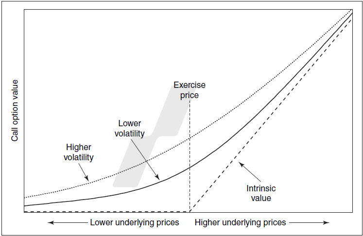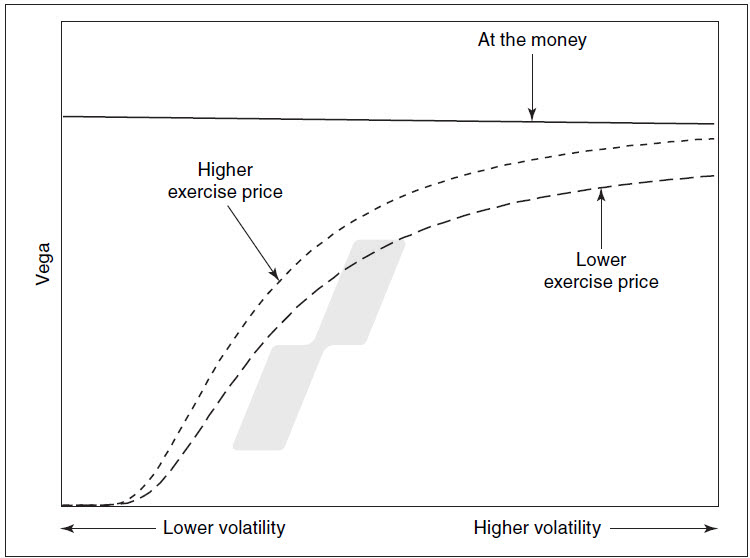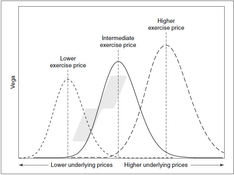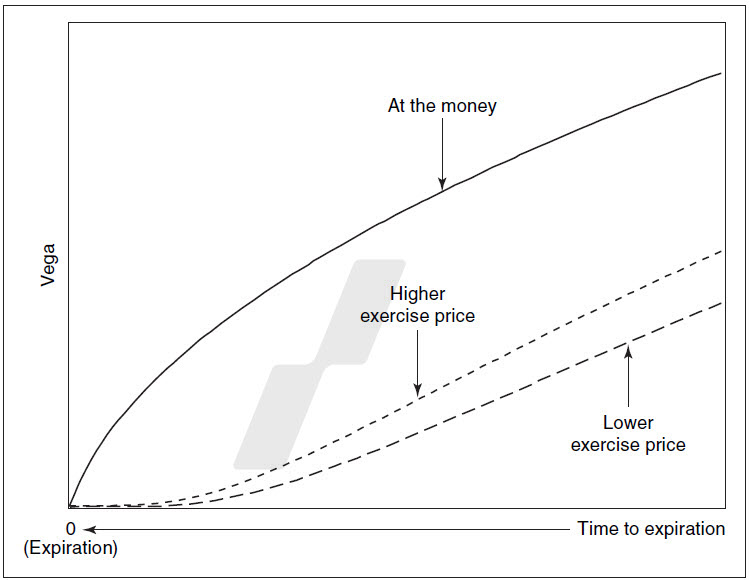 Dans un cycle d’expiration donné, c’est le véga des options à la monnaie qui est le plus élevé. Et, toutes choses étant égales par ailleurs, le véga d’une option à la monnaie dont le prix d’exercice est supérieur est plus élevé que le véga d’une option à la monnaie dont le prix d’exercice est inférieur. Dans la figure ci-dessous, on peut voir que le pic du véga d’une option dont le strike est inférieur (lower exercise price) est inférieur au pic du véga d’une option dont le strike est supérieur (higher exercise price).