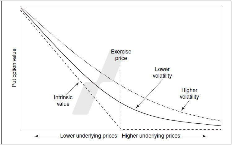 La valeur d’une option augmente avec la volatilité, comme le montrent les figures ci-dessus (valeur d’un call) et ci-dessous (valeur d’un put). C’est ce qu’explique Sheldon Natenberg, dans son remarquable ouvrage Option Volatility and Pricing Advanced Trading Strategies and Techniques, dont nous reprenons les leçons dans cet article. Le véga d’une option est la mesure dans laquelle la valeur d’une option augmente (diminue) quand la volatilité augmente (diminue). Il exprime généralement le nombre de dollars ou d’euros qu’il faudrait ajouter à la valeur de l’option si la volatilité augmentait d’un point de pourcentage ; et le nombre de dollars ou d’euros qu’il faudrait soustraire à la valeur de l’option si la volatilité diminuait d’un point de pourcentage. Comme la valeur d’une option tend toujours à augmenter lorsque la volatilité augmente, le véga est toujours un nombre positif.