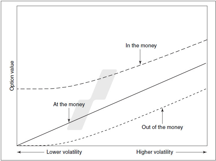 Dans le graphique ci-dessus, on peut voir que la ligne qui représente l’évolution de la valeur théorique d’une option à la monnaie en fonction de la volatilité est une ligne droite. Cela signifie que le véga d’une option ne varie guère en fonction de la volatilité tant que celle-ci reste à la monnaie. Si la volatilité passe de 25 % à 35 %, puis à 45 % et que, pendant tout ce temps, l’option de strike X reste à la monnaie, son véga reste le même.