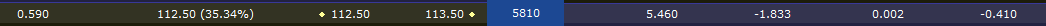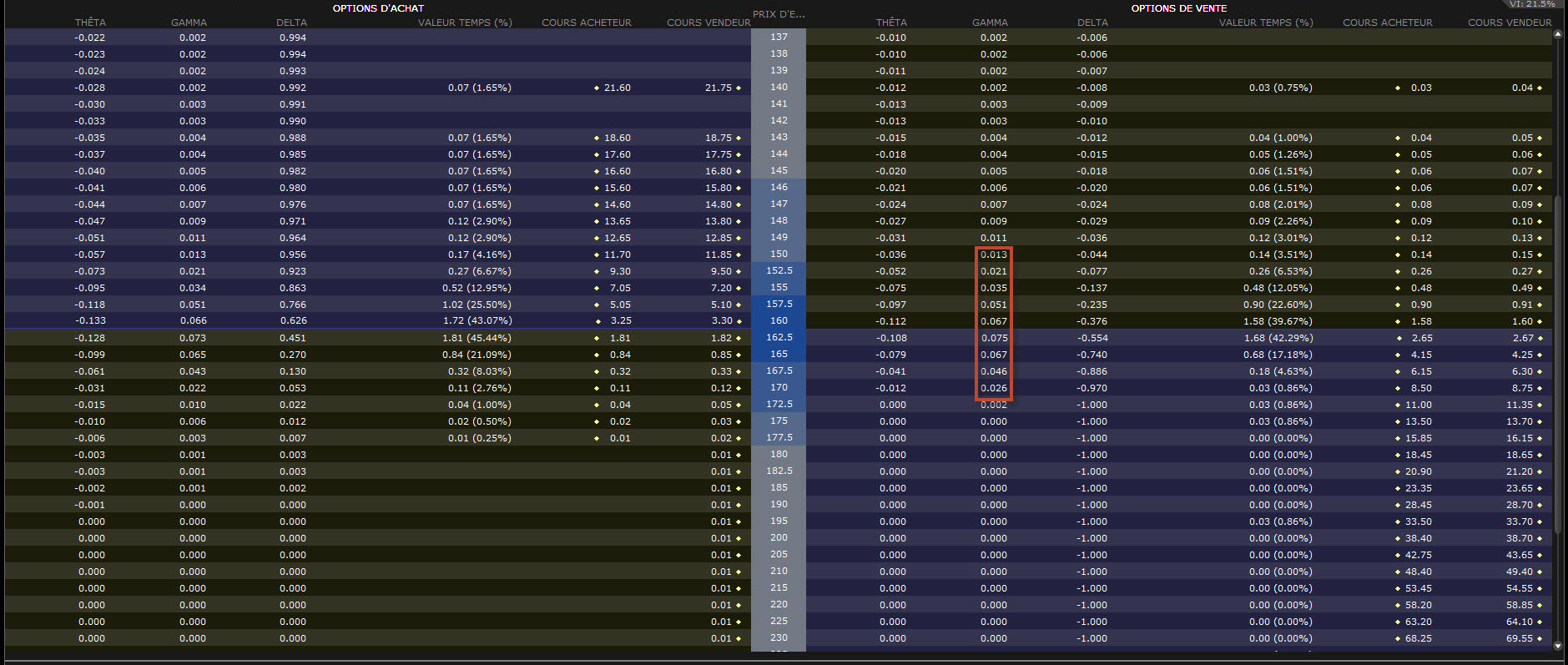 Le delta d’une option à la monnaie a tendance à peu s’écarter de la valeur 50. Dans l’image ci-dessous, on peut voir que, avec un prix du sous-jacent égal à 5809 points, le call 5810 à la monnaie a un delta de +0,59. Et on peut voir que le put à la monnaie a un delta de -0,41.