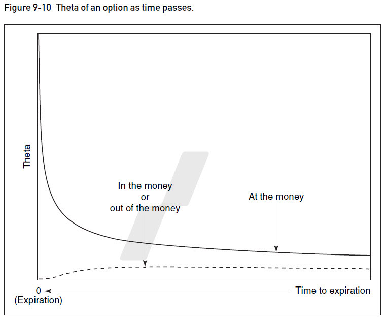 Lorsque les options d’un cycle donné sont loin de leur échéance, les options à la monnaie, dans la monnaie et hors de la monnaie voient leur valeur temps s’éroder à des rythmes semblables, comme le montre l’illustration ci-dessus. Mais, plus on s’approche de l’échéance, plus le rythme de l’érosion diminue chez les options dans la monnaie et les options hors de la monnaie. En revanche, ce rythme augmente chez les options à la monnaie. Si bien que le thêta d’une option à la monnaie s’envole à l’approche de l’échéance.