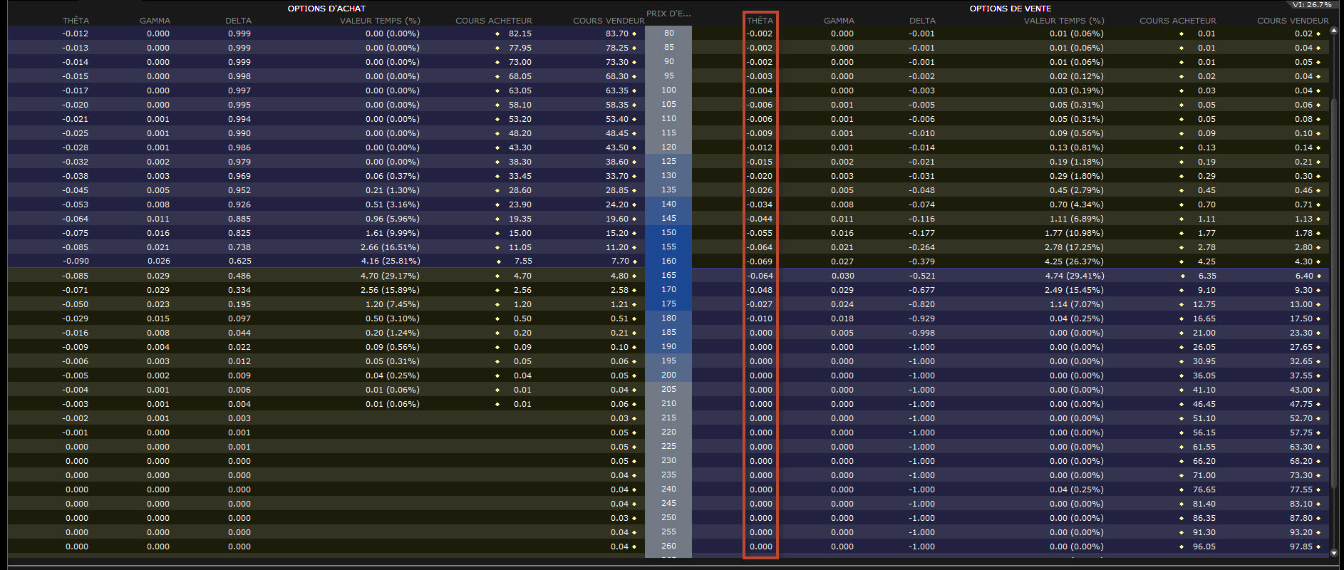 Dans un cycle d’expiration donné, ce sont les options à la monnaie qui ont le thêta le plus élevé. Et, lorsqu’une option passe dans la monnaie ou hors de la monnaie, plus elle s’éloigne du strike à la monnaie, plus son thêta diminue. Cela s’explique par le fait que le thêta d’une option dépend de sa valeur temps. Comme les options qui sont très éloignées du strike à la monnaie ont une faible valeur temps, elles ont également un faible thêta.