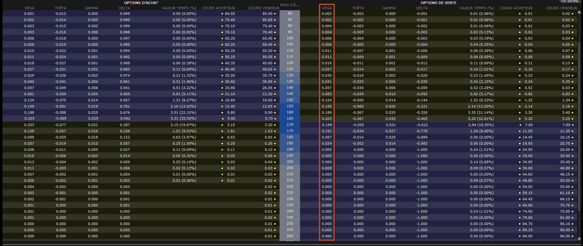 Comme dans le cas du thêta, dans un cycle d’expiration donné, c’est le véga des options à la monnaie qui est le plus élevé.