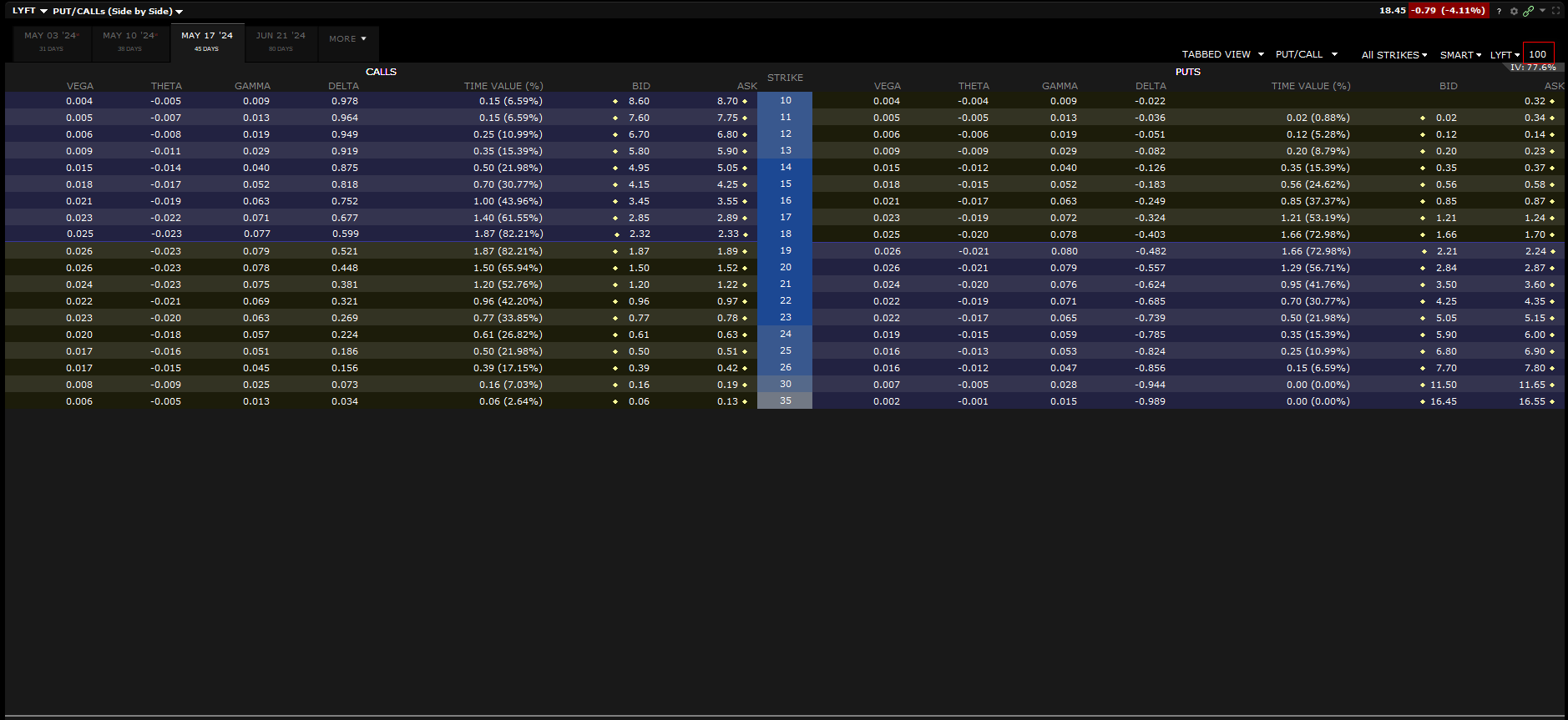 Pour vous assurer de la quantité du sous-jacent à laquelle vous donne droit telle ou telle option, rendez-vous dans la chaîne d’options et entrez le symbole du sous-jacent. La quantité du sous-jacent apparaîtra en haut à droite de votre écran. Dans l’exemple ci-dessus des options sur l’action Lyft, on peut voir que la quantité à laquelle ces options donnent droit s’élève à 100 (cf. notre encadré rouge).