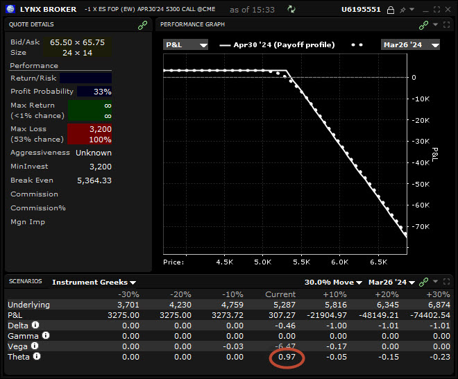 Le thêta d’une position short call est positif : avec le temps, la valeur extrinsèque de l’option diminue, ce qui augmente le profit potentiel du vendeur de l’option ou réduit sa perte latente.