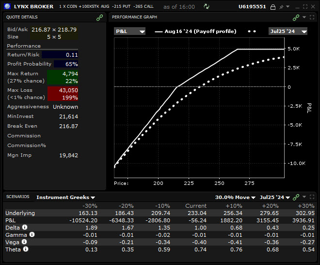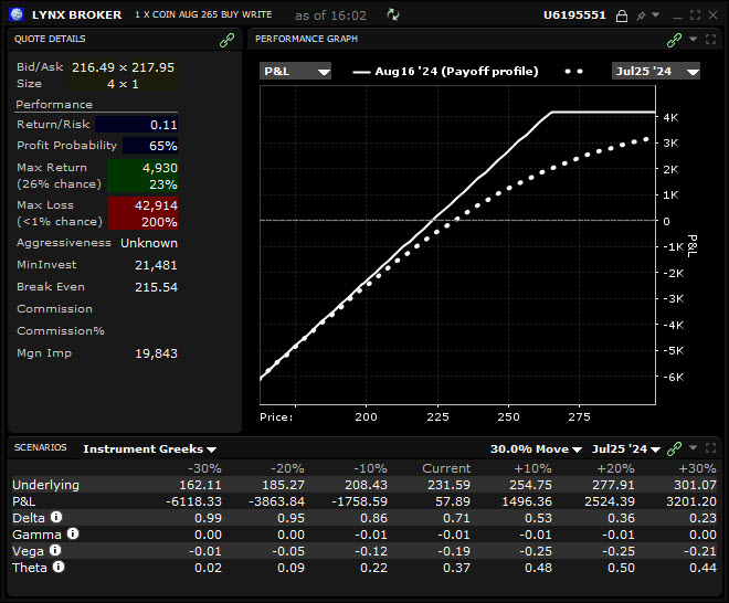 La stratégie du covered strangle permet de bénéficier d’un meilleur thêta positif que celui du covered call. Dans l’image ci-dessus, on peut voir que le thêta du covered strangle s’élève à 0,74. Mais, on peut voir dans l’image ci-dessous que le thêta du covered call équivalent n’est que de 0,37.